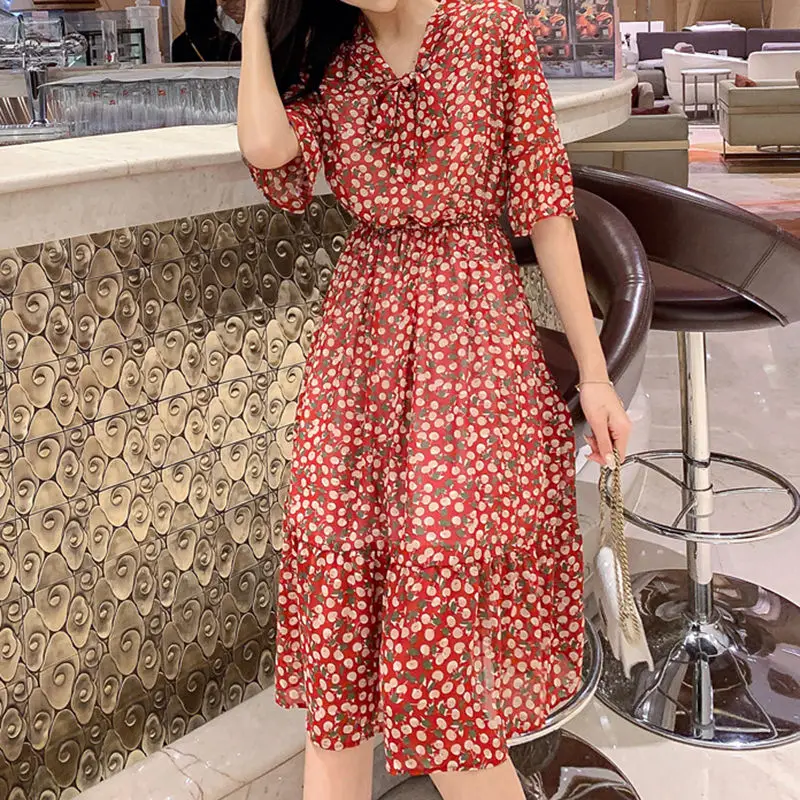 Korean Casual Print Women Party Dress Nice Bohemian Lady Flare Half Sleeves Knee Length Bow O Neck Dresses Women Chiffon Dress Dresses Aliexpress